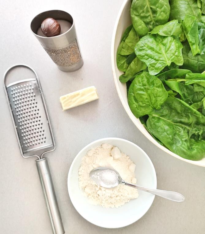 70 g Dinkelmehl, 1 EL Parmesan, Muskatnuss, Salz, Pfeffer.