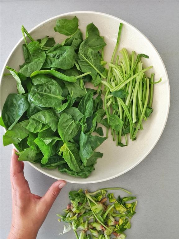 - Eine Zwiebel fein schneiden und in der Pfanne mit Salz und mittlerer Hitze glasig dünsten. Den gewaschenen frischen Spinat samt Stile zufügen und 5 Minuten durchgaren. Nach dem Abseihen das Wasser mit einer Gabel auspressen und den Spinat fein pürieren. Dem noch lauwarmem Spinatmus das Dinkelmehl und den Parmesan unterkneten und mit den Gewürzen kräftig abschmecken.
