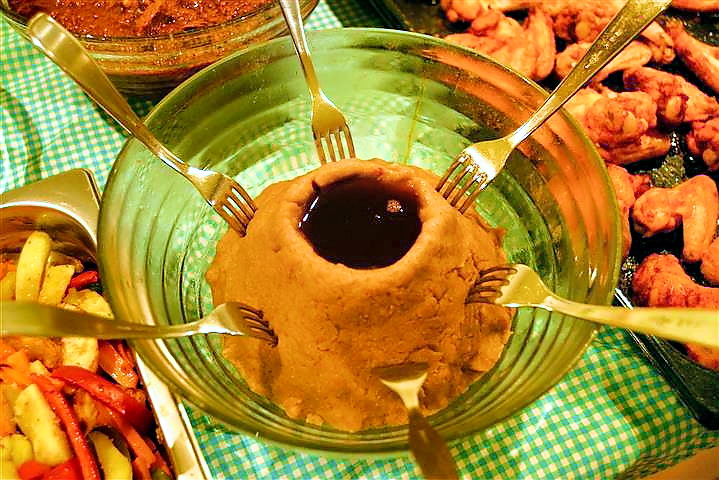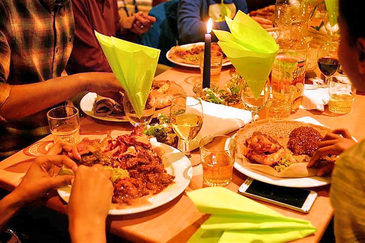 Ingera, ist ein gesäuertes Fladenbrot, das überwiegend aus Teffmehl hergestellt wird. Tsega, die Mutter von Zersenay mischt die Zwerghirse noch mit Roggenmehl und lässt den Teig 1-2 Tage in der warmen Küche stehen, zum Gären. Die Rezeptur ist sehr individuell und es gab an diesem Abend auch unterschiedliche Fladen, die aus verschiedenen Mehlen zusammengerührt wurden. Die Fladen werden in schmackhafte Fleisch- und Gemüsesoßen mit vielen Zwiebeln getunkt.