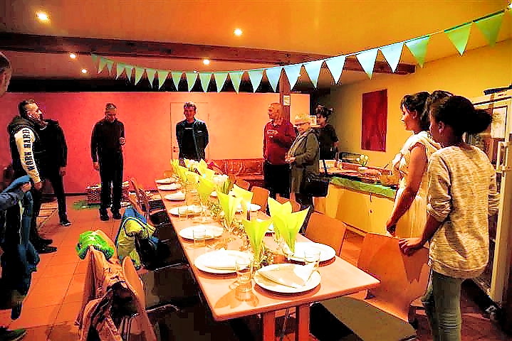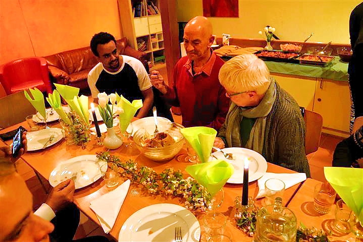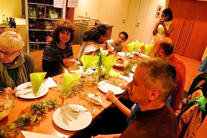 Das Mahl endete mit einer Kaffeezeremonie, die von der Tochter Chiara durchgeführt wurde. Dazu röstete sie in einem speziellen Pfännchen den noch grünen Rohkaffee bis dieser braun wurde. Der Kaffeegenuss wurde quasi zelebriert und das duftende Getränk aus kleinen Schalen getrunken. Normalerweise mit viel Zucker doch wir Europäer bekamen ihn auch ohne Zucker serviert! Dazu gab es leckeren schweizer Schokokuchen von Birgit gebacken. Alles in allem ein sehr gelungener afrikanisch-schweiz-deutscher Abend. Ach, was mich sehr beeindruckt hat, die Profiküche im Andreashaus, wurde nach dem Kochen von der Familie nach schweizer Standard geschruppt und Tip Top hinterlassen. Ich hätte das so nicht geschafft!