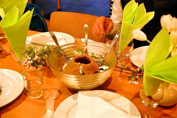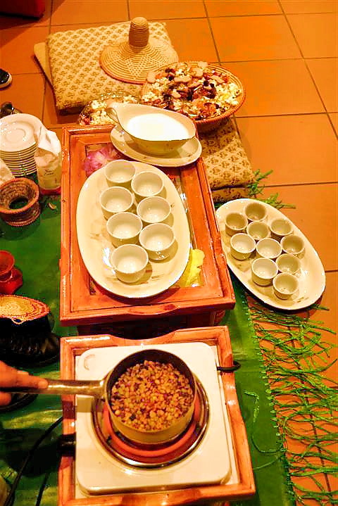 Gaat, ein scharf gewürzter Getreidebrei mit karamellisiertem Zucker, wurde als Vorspeise gereicht und mit Yoghurt aus einer Schüssel mit vielen Gabeln gegessen.