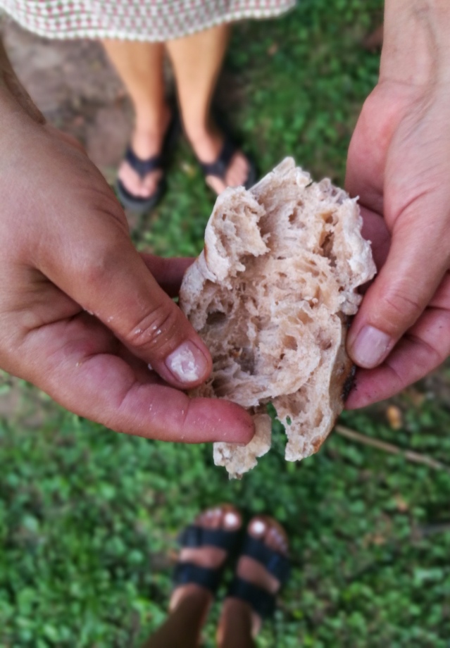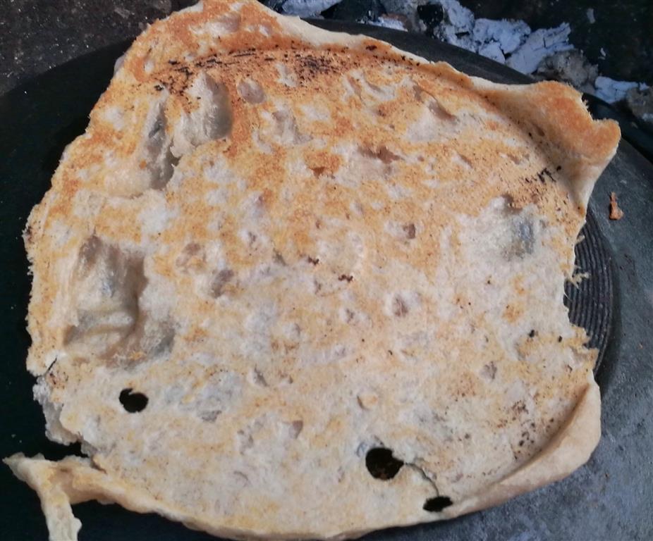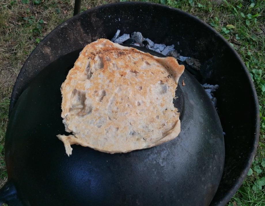 Ich backen auch gerne aus einer Handvoll Teig kleine Fladenbrote, die ich auf einem umgedrehten, feuerfesten Topf über dem Feuer ausbacke. Dazu nehme ich meine Wog und drehe sie über der Feuerschale um und lass diese gut 10 Minuten heiß werden. Danach ein kleines Teigstück mit der Hand leicht einölen und zu einem recht dünnen Fladen ziehen und auflegen. Der Fladen sollte erst umgedreht werden, wenn er sich leicht von den Ecken her mit einer Gabel lösen lässt. Dies tut er aber nur, wenn der Topf vorher richtig heiß ist. Backzeit je nach Dicke ca. 3-4 Minuten pro Seite.