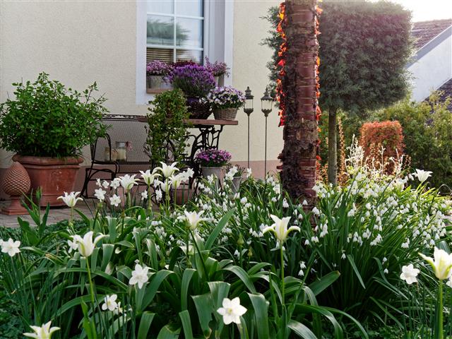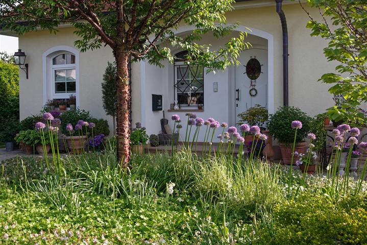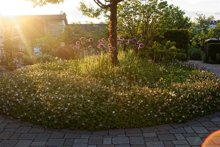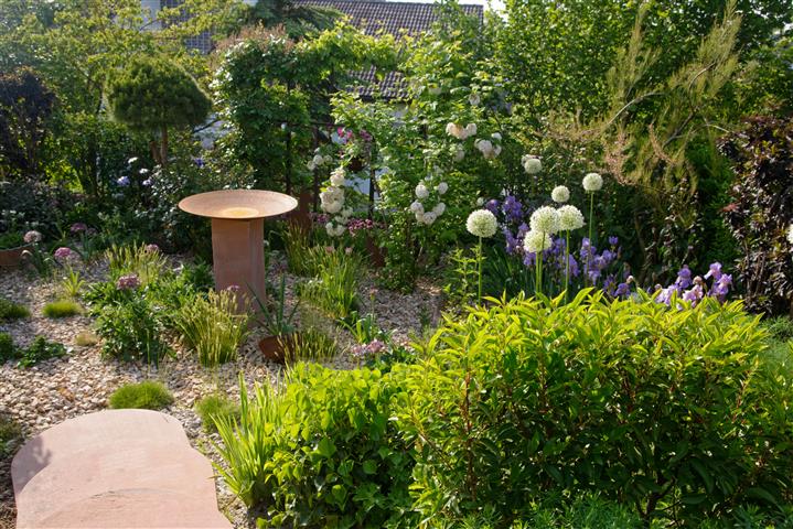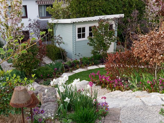Gartenregel Nr. 1: Der Garten muss zum Haus passen: Also das Haus wird mit einem romantischen Garten umgeben. Als erste Pflanzung kamen die hochgeasteten Glanzmispelbäume in den Garten, ein Schnäppchen aus der Gärtnerei Vonderstrass in Freiburg. Ziemlich zeitgleich wurde der Terrassengarten zur Straße hin überwiegend mit mediterranen Gewächsen und Gräsern bepflanzt. Ein blickschönes Gerätehäuschen wurde aufgebaut von dem eine Zypressenallee runter auf die Straße führt. Zum Nachbarn hin wurde eine Eibenhecke gepflanzt, diese immergrüne Kulisse bildet den Hintergrund für ein Staudenbeet. Um das Haus herum wurden verschiedene Inselbeete mit besonderen Bäumen oder Sträuchern angelegt. Zum Schluss kam ein Kiesgarten mit bepflanzter Treppe hinzu. Das sind, wie der Engländer sagt, die Knochen sprich das Gerüst dieses besonderen Gartens. Tauchen Sie ein in dieses kleine Paradies.