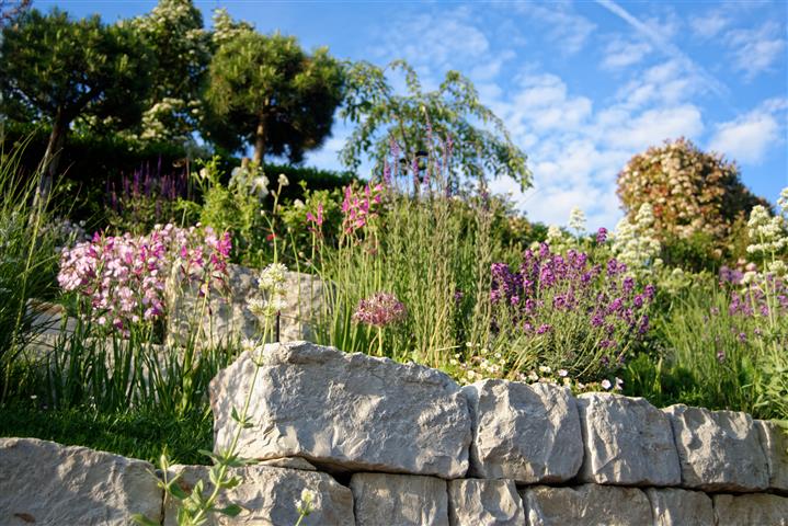 Denn schon beim Vorbeifahren am Haus sieht man von der Straße aus, dass sich hinter dem terrassierten Hang ein besonderer Garten verbirgt. Der Garten ist zu allen Jahreszeiten eine Augenweide, mir persönlich gefällt er am besten im Spätherbst mit Raureif. So fällt es mir schwer bei diesem opulenten Garten eine Auswahl an Fotos zu treffen, da mir zu viele gefallen und das würde den Rahmen hier sprengen. Also beschränke ich mich auf die Fotos, die hauptsächlich bei der offene Gartentür im Juni letzten Jahres entstanden sind. Der Garten ist ca. 6 Jahre alt und wurde von einer befreundeten Gartenbaufirma mit Kalksteinmauern und Treppen terrassiert. Die Bepflanzung übernahm dann die Hausherrin über die Jahre selbst. Sie malt mit Farben und Formen ihren Garten. Der Hausherr ist für das Einpflanzen der Bäume und Sträucher zuständig, sowie für das Herbeischaffen verschiedener Erden aus dem nahegelegenen Steinbruch. Die befreundete Gartenarchitektin Karina Waltzer steht manchmal mit Rat und Tat zur Seite.
