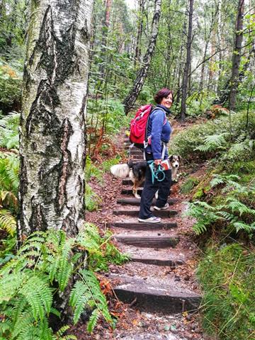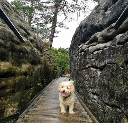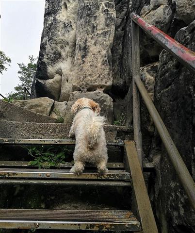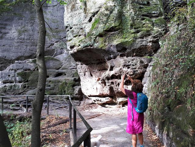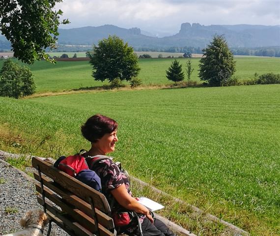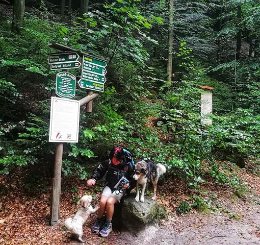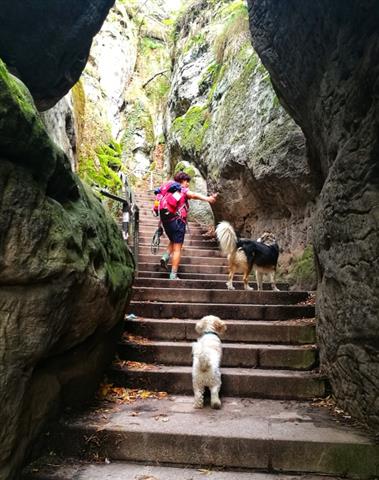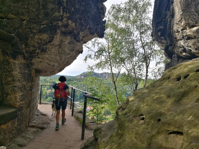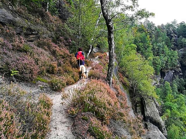Wir waren mit Augustusreisen im Elbsandsteingebirge unterwegs. Diese Wanderreise hatte meine Schulfreundin Gundi ausgesucht. Der Clou bei der Reise war, dass unser Gepäck von Hotel zu Hotel transportiert wurde und die Unterkünfte vom Reiseveranstalter ausgesucht wurden. Wir waren also mit kleinem Rucksack unterwegs und konnten auch unsere Hunde auf die Tour mitnehmen. Wir wanderten auf den sandig weichen Wegen berühmter Maler, der berühmteste davon war Caspar David Friedrich und auch der einzige, den wir kannten. Der Weg wurde sogar 2007 zum schönsten Wanderweg in Deutschland gekürt. Wir kannten die Gegend in der Nähe von Dresden noch nicht und waren gespannt was uns erwartete. Die Wanderreise begann in dem lebhaften Kurort Bad Schandau in der stilvollen Albergo Toscana und endete nach 6 Wandertagen wieder dort. Mit den Hunden konnten wir nicht alle Steige gehen, aber vom Veranstalter wurden wir auf schöne Wege umgeleitet und an zu steilen Leitern und Treppen vorbeigeführt. Eine durch und durch gelungene Wanderreise, wir hatten auch Glück mit dem Wetter, denn es regnete nur am ersten Vormittag. Schaut selbst auf unsere Reiseimpressionen und auf die Beschreibungen am Ende der Fotogalerie.