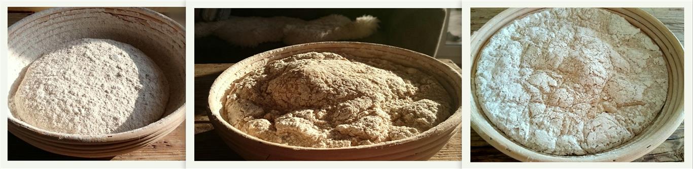 Foto links: Direkt nach dem Kneten. Foto mitte: Nach 10 Stunden ruhen, die Oberfläche ist hier leider etwas an der Klarsichtfolie hängen geblieben. Foto rechts: Weitere 30 Minuten später.