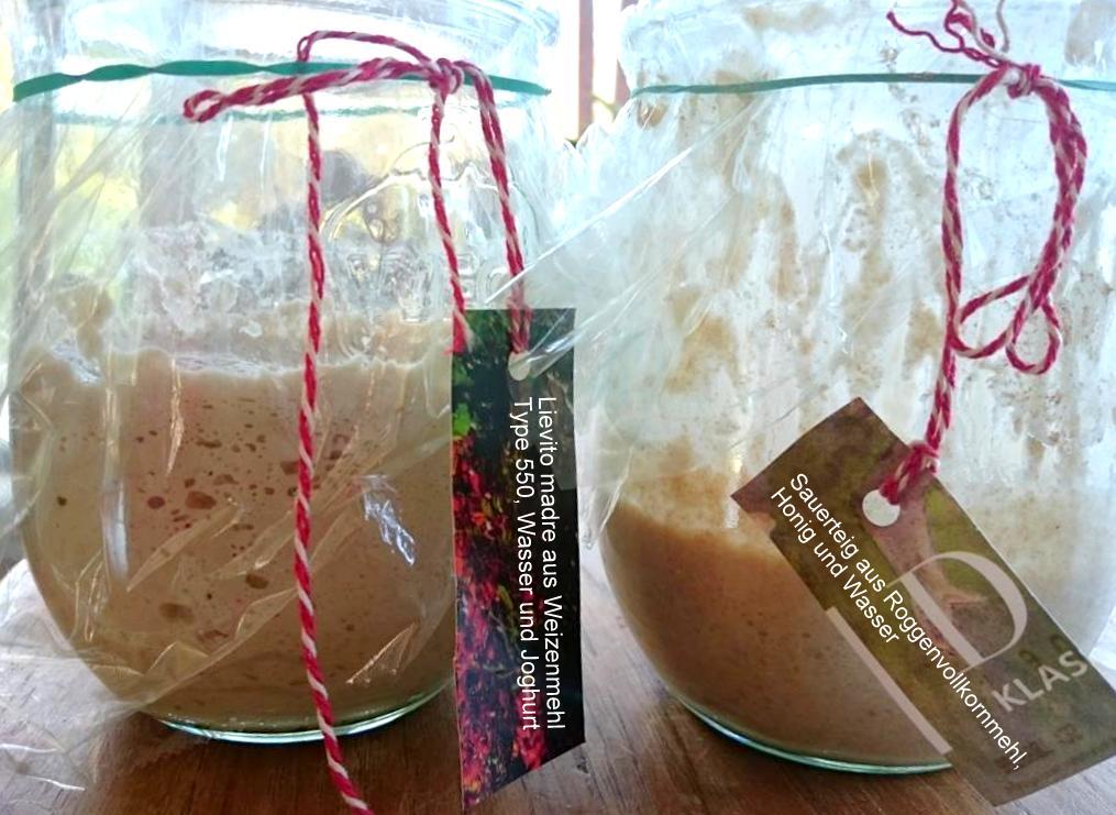 So sieht Lievito Madre und der Sauerteig bei mir aus, in 1L Gläser im Kühlschrank gelagert. Auf den Zettel notiere ich das Auffrischdatum. Ich entnehme zum Backen je 100g und die Reste im Glas werden mit 50g Mehl und 50g Wasser über Nacht gefüttert. Danach gehen die Gläser wieder ibis max. 3 Wochen n den Kühlschrank..