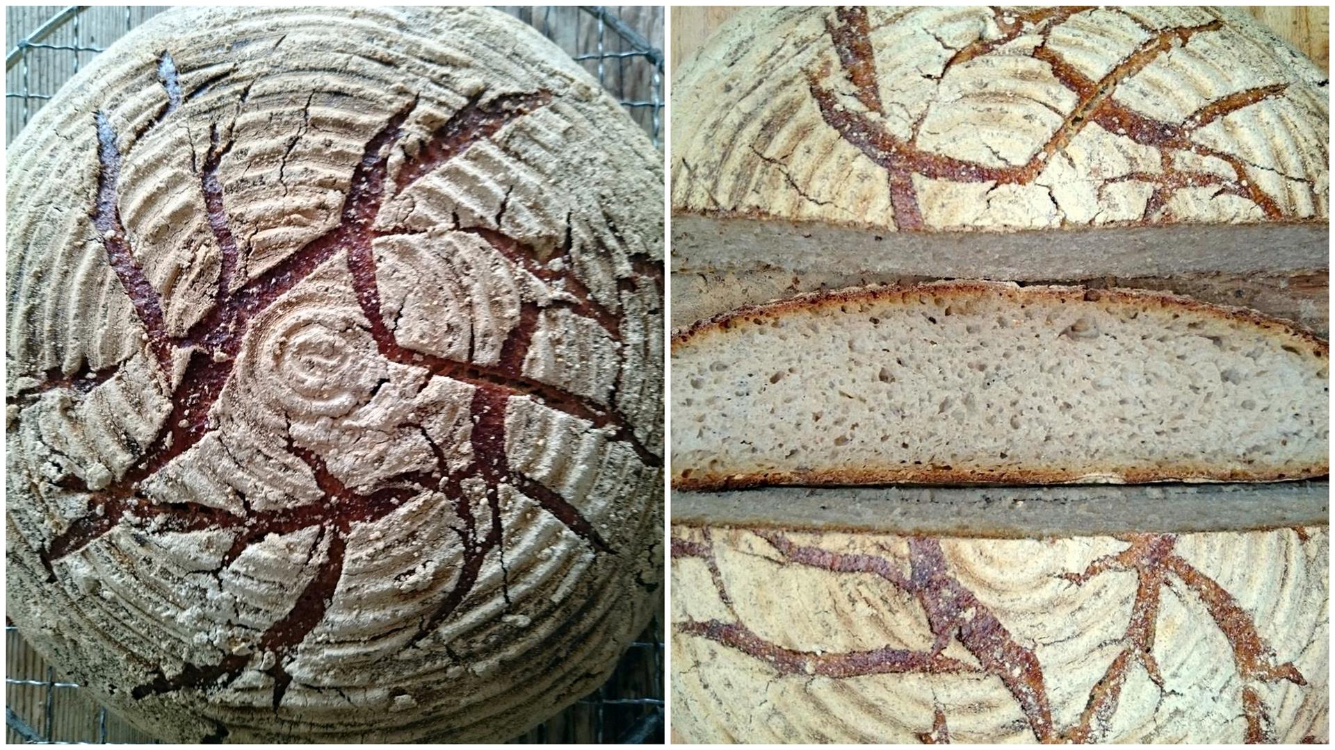 Die beiden unterschiedlichen „Sauerteige“ bewahre ich schon seit längerem im Kühlschrank auf und zwei mal im Monat wird aufgefrischt. Dabei fallen immer jeweils 100g Teigmenge an, die ich oft weiter geben oder – in einem Brot verbacke. Dazu aktiviere ich beide Teige über Nacht und morgens vermenge ich sie mit den restlichen Zutaten zu einem Brotlaib. Danach ruht der Brotteig in einem Gärkorb und kann abends gebacken werden. Ist das Brot gebacken, kann es nach 1,5 Stunden angeschnitten werden. UND weil das Brot keine Hefe enthält, bleibt es noch tagelang unglaublich saftig und frisch.