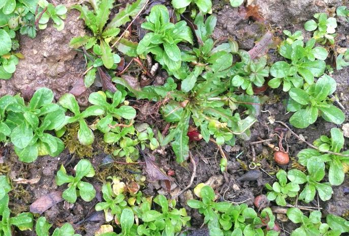 Jutta hat bereits im April 2015 ein Pesto über Wildkräuter vorgestellt, mit sehr schönen Bestimmungsbildern. In meinem Garten im März 2017 habe ich gefunden: Feldsalat, Schnittlauch (beides nicht wild, sondern im August letzten Jahres angesät), Brennesseln, Bitterschaumkraut, Gundermann, Quecke, Gänseblümchen, Erdbeerblätter, und Löwenzahn, die ich nun versmoothst habe.