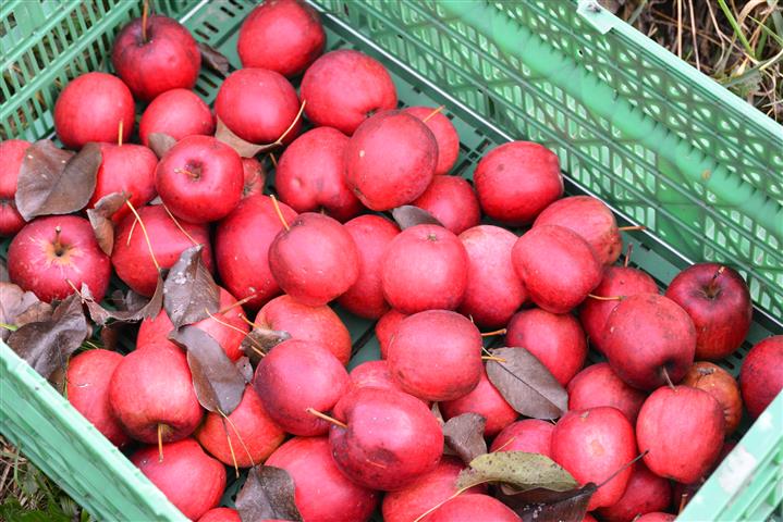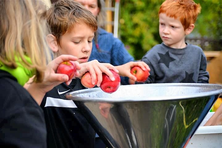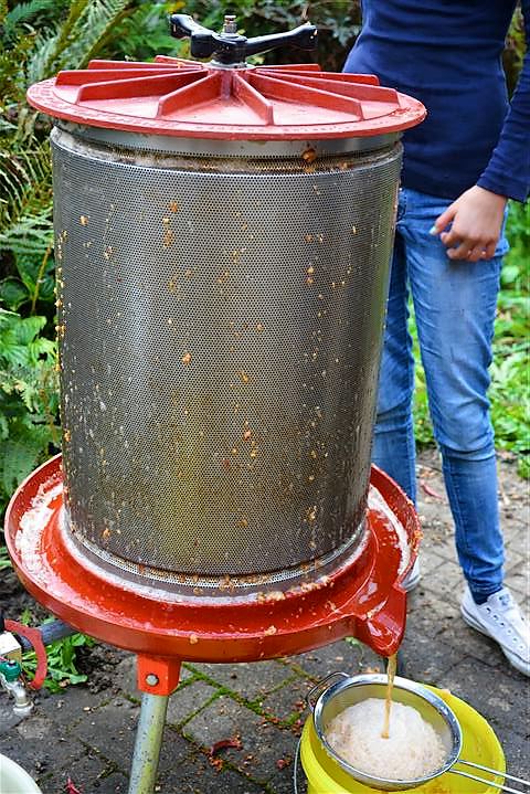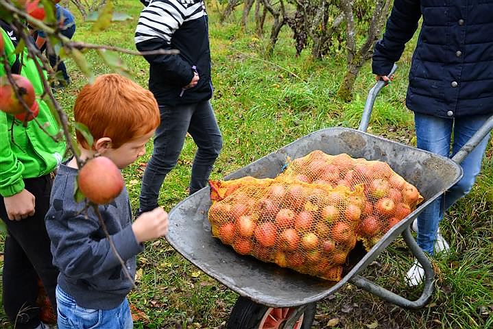 Wir dürfen die heruntergefallenen Äpfel aufsammeln, auch einige Birnen, aber kein faules oder schimmliges Obst. Bei so vielen Händen sind im Nu die Eimer und Säcke gefüllt und mit der Schubkarre zum Hof transportiert. Dort stehen moderne Geräte zum Mahlen und Pressen der eingesammelten Äpfel bereit. Zuerst müssen die Äpfel gewaschen werden, danach kommen sie in die elektrische Mühle zum Zerkleinern oder Mahlen. Das daraus entstandene saftige Mahlgut nasche ich gerne, es schmeckt mir besser als der ganze Apfel. Danach geht die Masse in die Presse. Wir füllen langsam den Presssack voll und schon durch leichtes drücken mit den Händen, fließt der köstliche honiggelbe Apfelsaft durch die Hydropresse. Am Ende wird mit dem angeschlossenen Wasserschlauch der letzte Saft herausgepresst. Hmm, unser selbstgepresster Apfelsaft schmeckt einfach nur gut und nach viel mehr.