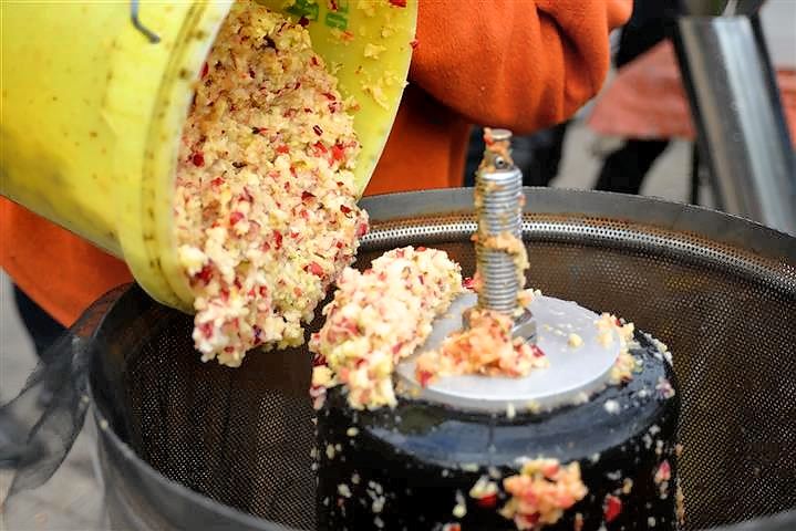 Wir dürfen  die heruntergefallenen Äpfel aufsammeln, auch einige Birnen, aber  kein faules oder schimmliges Obst. Bei so vielen Händen sind im Nu  die Eimer und Säcke gefüllt und mit der Schubkarre zum Hof transportiert. Dort stehen moderne Geräte zum  Mahlen und Pressen der eingesammelten Äpfel bereit. Zuerst müssen die Äpfel gewaschen werden, danach kommen sie in die elektrische Mühle zum Zerkleinern oder Mahlen. Das daraus entstandene saftige Mahlgut nasche ich gerne, es schmeckt mir besser als der ganze Apfel. Danach geht die Masse in die Presse. Wir füllen langsam den Presssack voll und schon durch leichtes drücken mit den  Händen, fließt der köstliche honiggelbe Apfelsaft durch die Hydropresse. Am Ende wird mit dem angeschlossenen Wasserschlauch der letzte Saft herausgepresst. Hmm, unser selbstgepresster Apfelsaft schmeckt einfach nur gut und nach viel mehr.