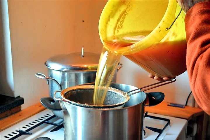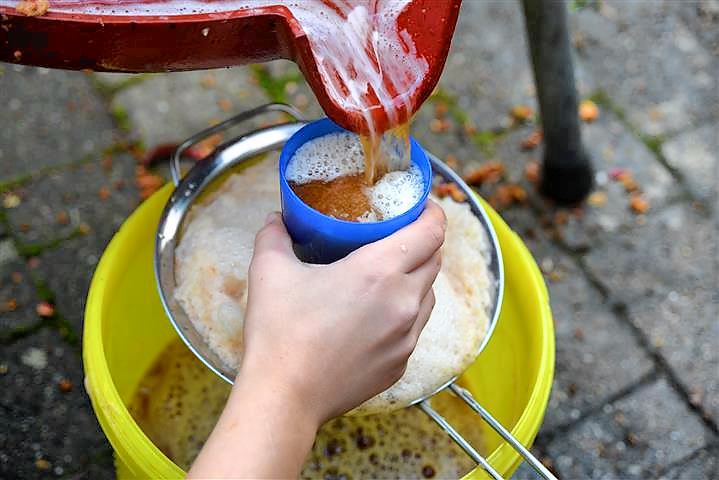 Wir bekommen aus 10 kg Äpfel ungefähr 5 l Saft heraus. Bei größeren Mengen können wir den Saft pasteurisieren das heißt durch Wärme haltbar machen. Almut erwärmt 5l Saft kurz auf 75 Grad, so bleiben neben wertvollen Mineralstoffen auch noch Vitalstoffe erhalten. Danach muss der heiße Saft schnell abgefüllt werden. Große Mengen kommen in 5 l Plastikbeutel oder bei kleineren reichen auch sterilisierte  Glasflaschen zum Abfüllen aus.