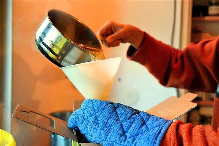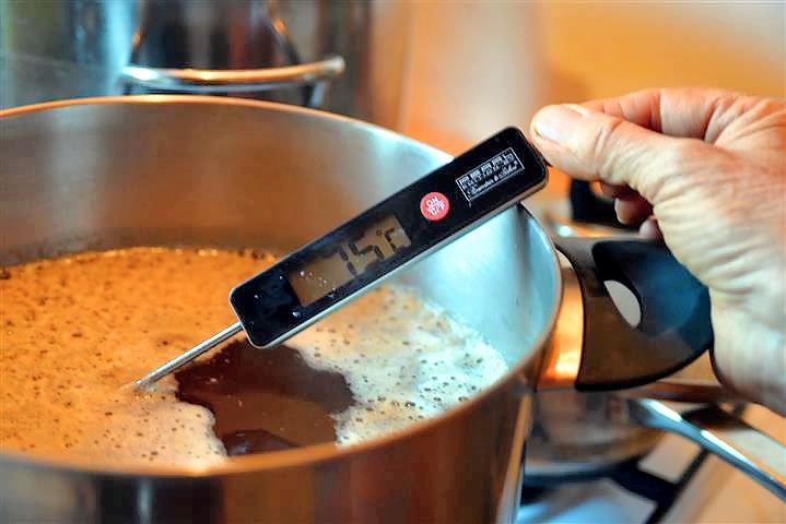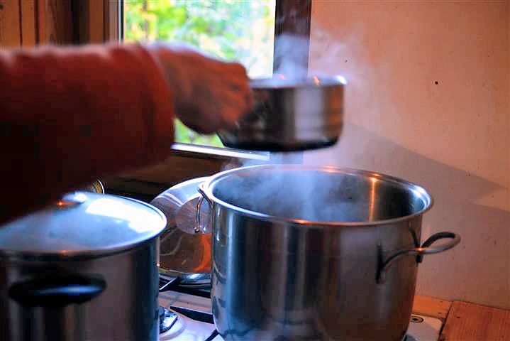 Wir bekommen aus 10 kg Äpfel ungefähr 5 l Saft heraus. Bei größeren Mengen können wir den Saft pasteurisieren das heißt durch Wärme haltbar machen. Almut erwärmt 5l Saft kurz auf 75 Grad, so bleiben neben wertvollen Mineralstoffen auch noch Vitalstoffe erhalten. Danach muss der heiße Saft schnell abgefüllt werden. Große Mengen kommen in 5 l Plastikbeutel oder bei kleineren reichen auch sterilisierte Glasflaschen zum Abfüllen aus.