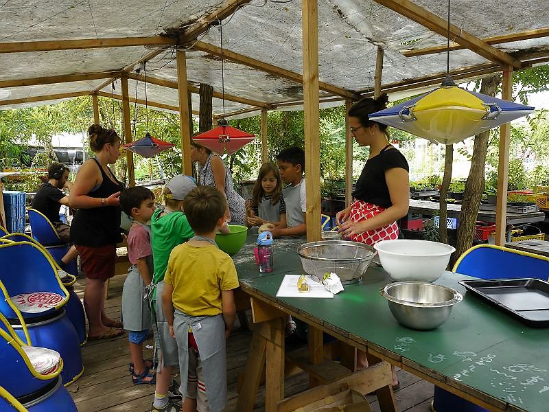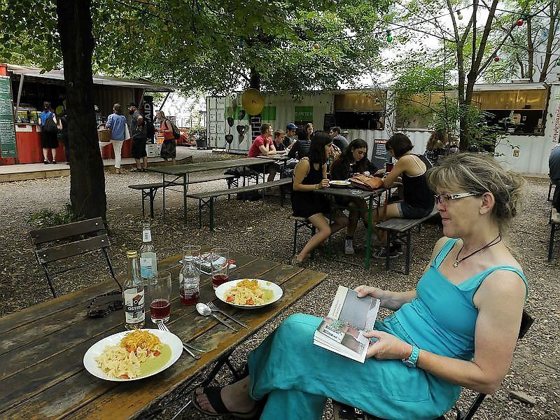 Heute gibt es Pasta mit Zucchinicreme und Salat – und dies wird dort gekocht wo die Zucchini, die Karotten und der Sellerie wachsen: In Berlin Kreuzberg am Moritzplatz mitten in Berlin im Prinzesinnengarten. Und gute Laune gibt es heute gratis zum Mittagsgericht dazu wie auf dem Schild an der Bar zu lesen ist.
